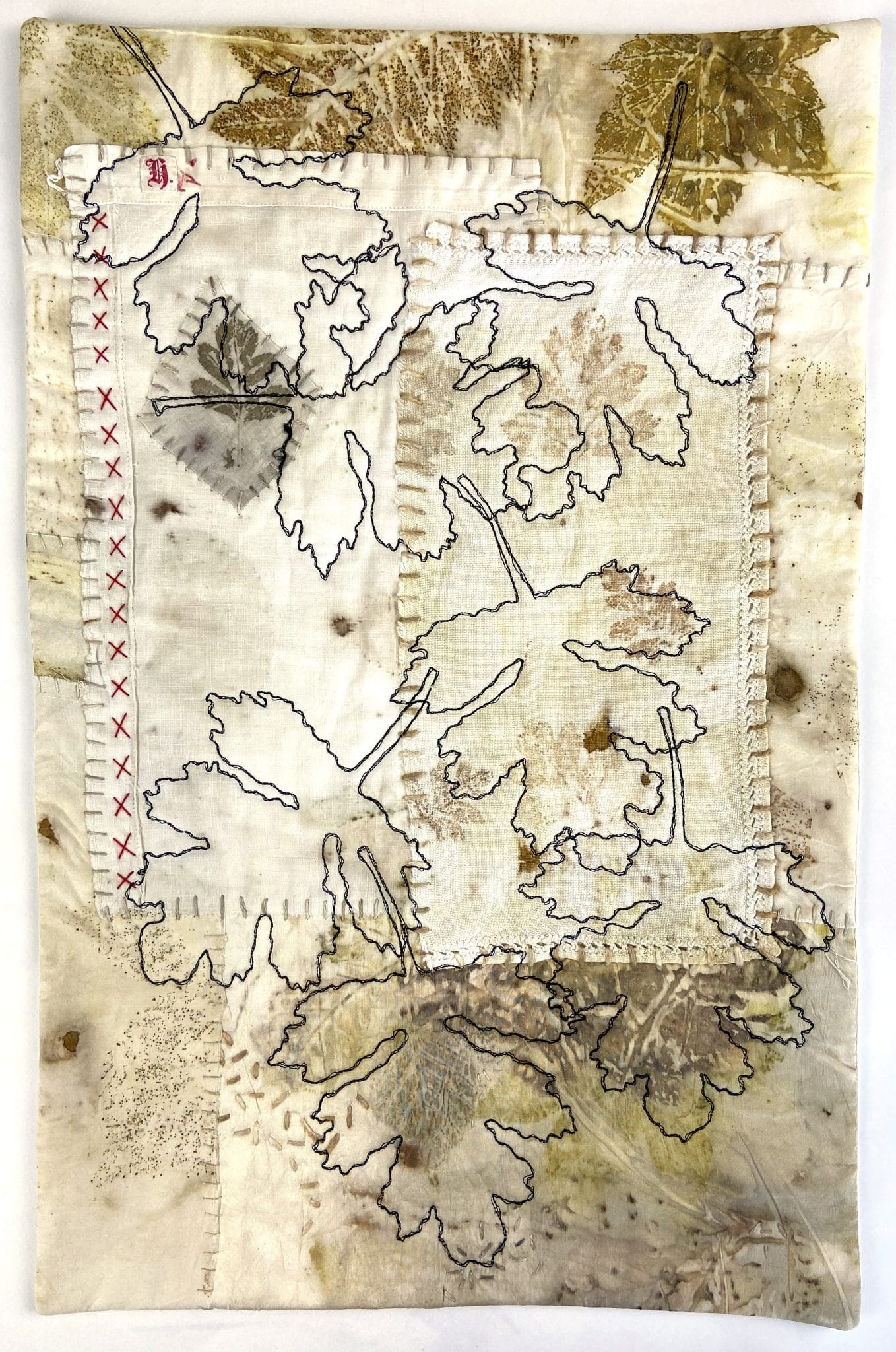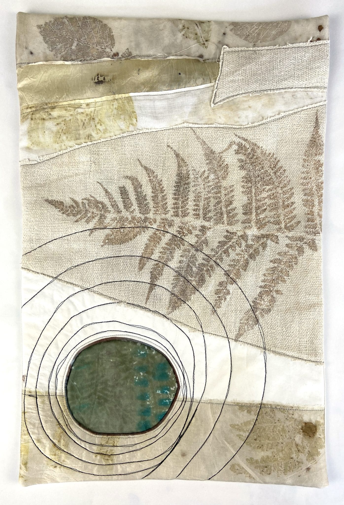 For this exhibition, which hung outside in the grounds of Tir na nOg near Drymen, I collected leaves from their woods and used them to colour fabric, by steaming and by cyanotype (blueprint).  The imagery on these quilted pieces was all directly from the woods where they hung them for several months in 2021.  By the end, nature was beginning to claim them as its own, as it added extra colour, with mildew and green and the sun bleached out much of the colour I’d added – an interactive exhibition with the woods which had inspired the work.